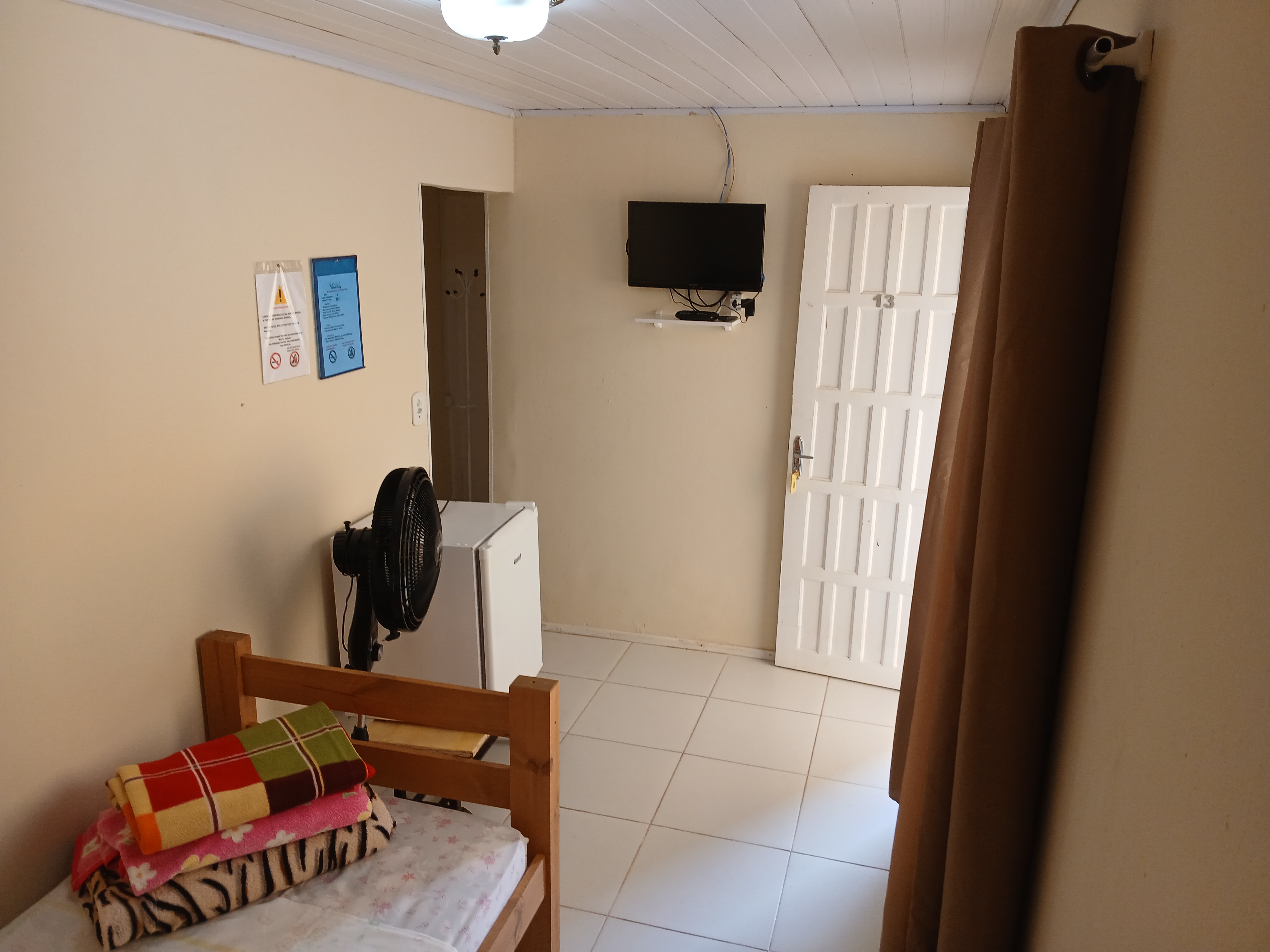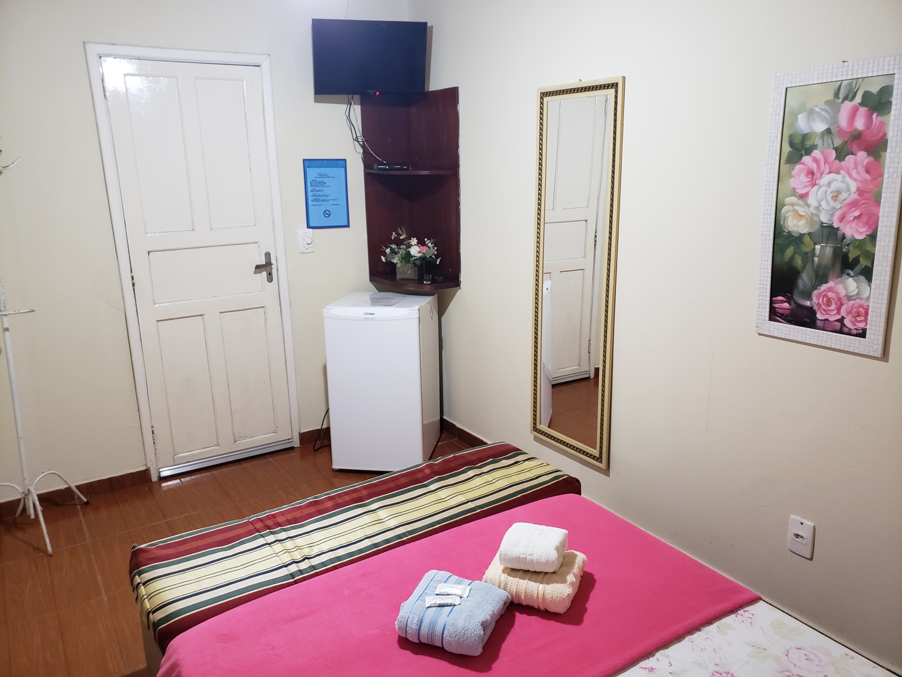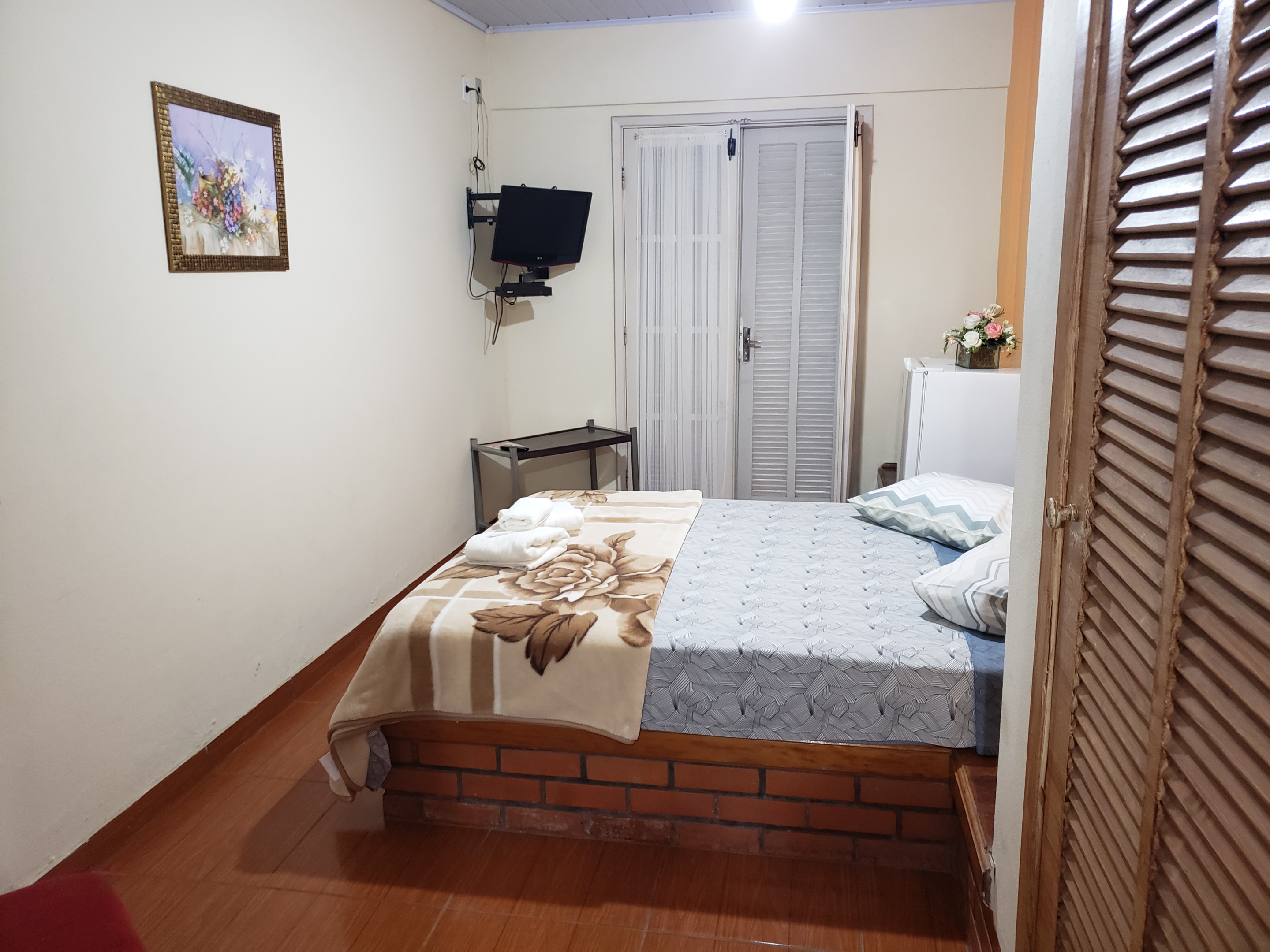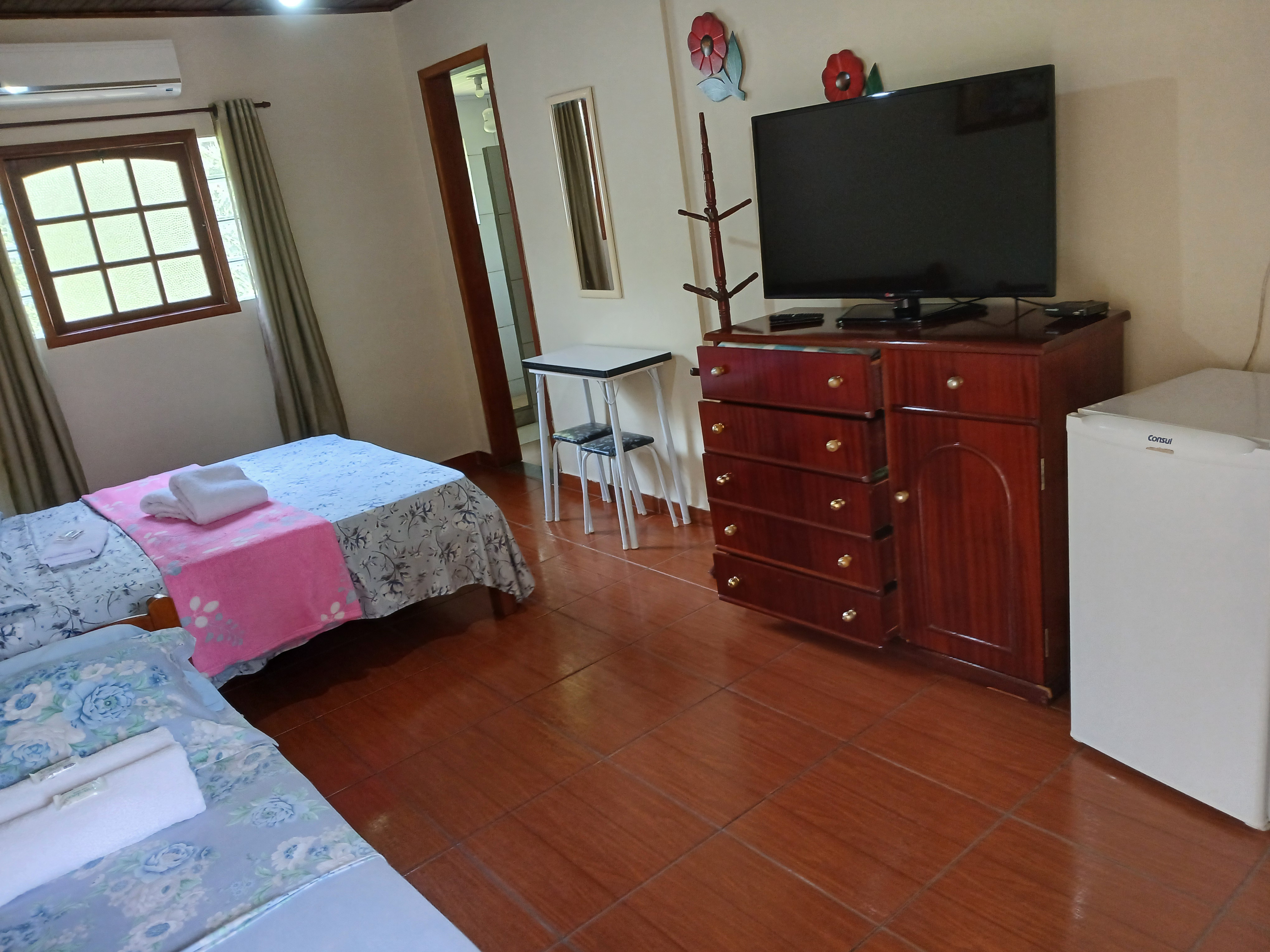 Quarto com uma cama de casal, 1 banheiro, um frigobar e uma TV LED.