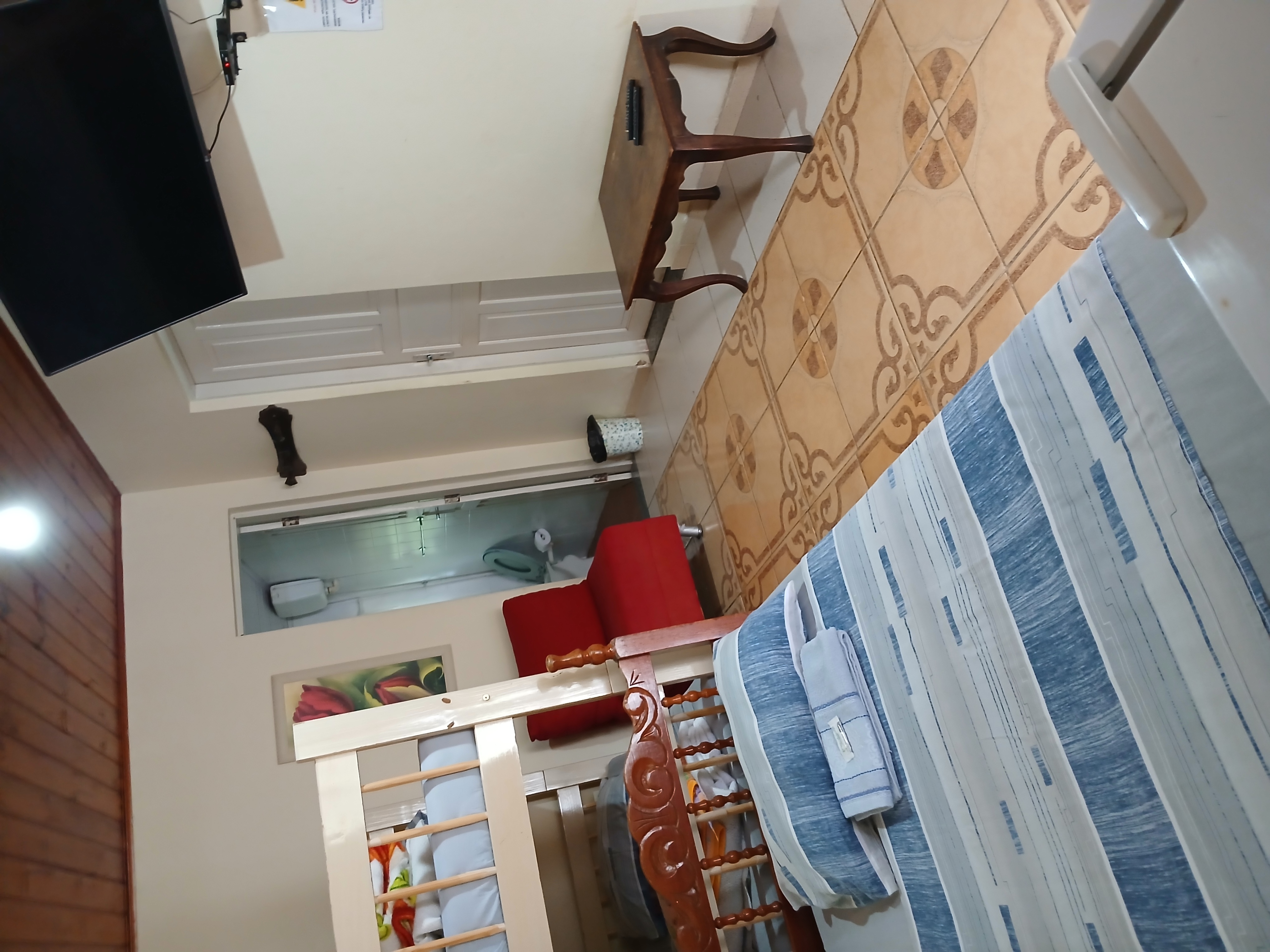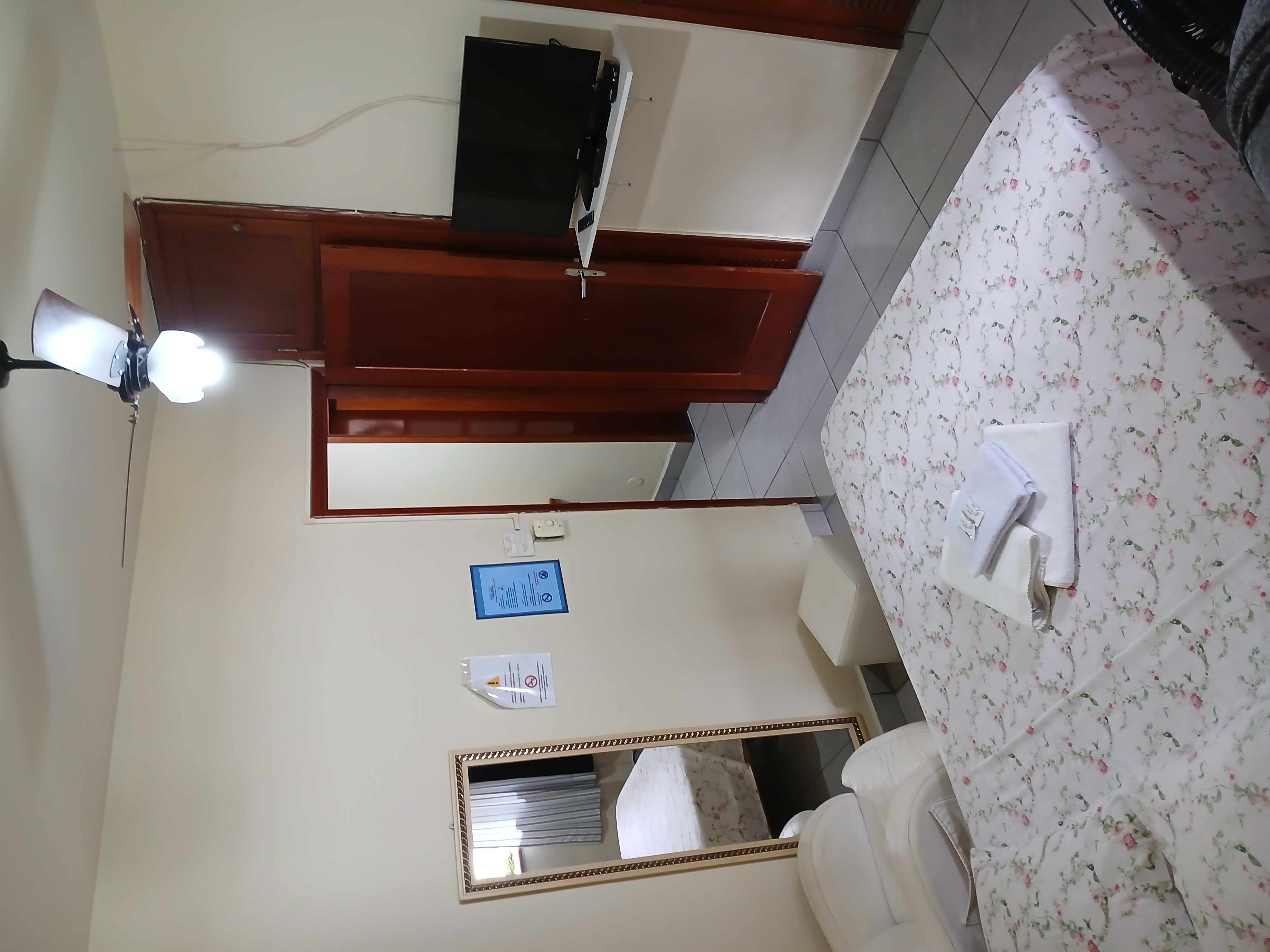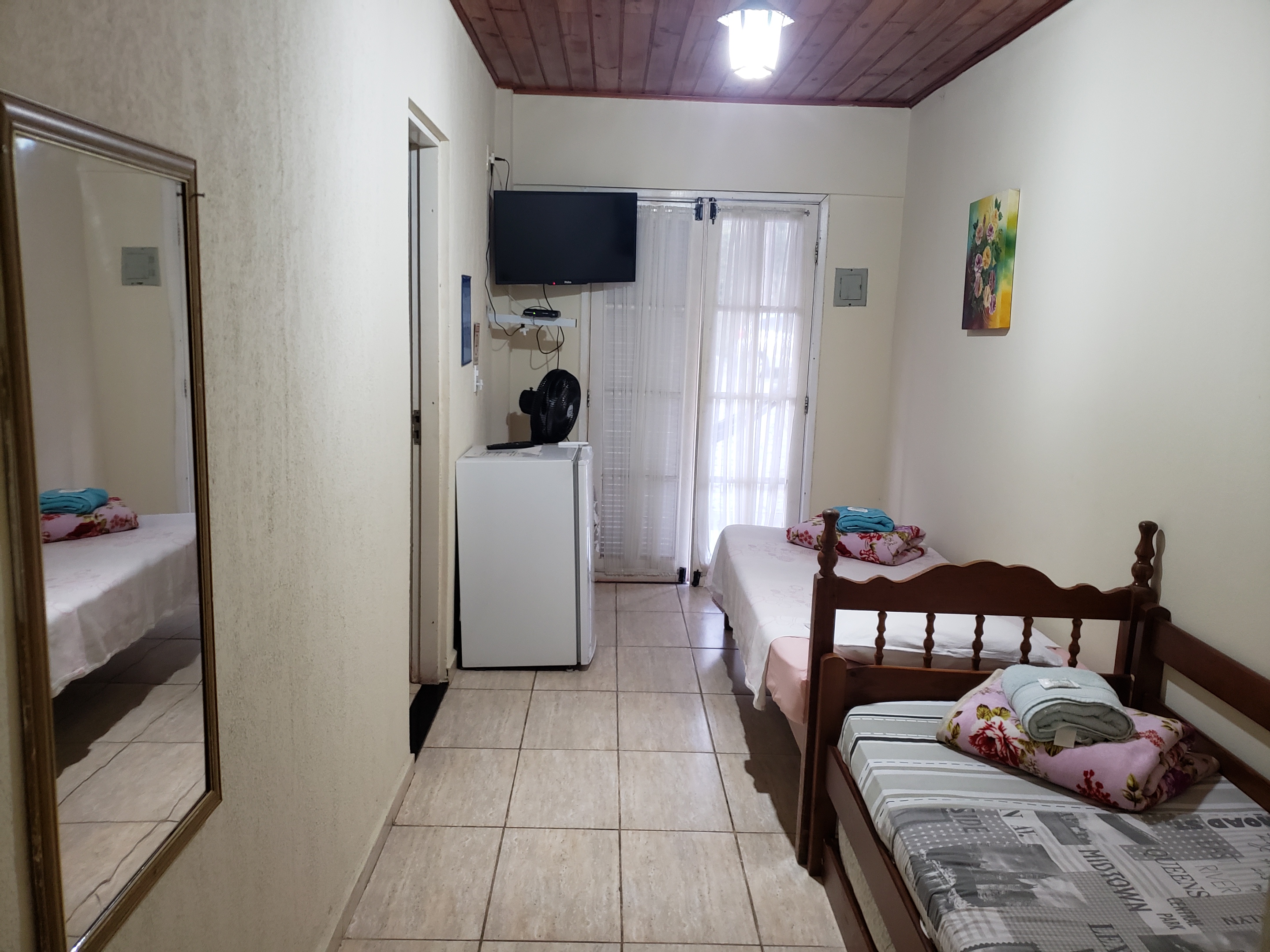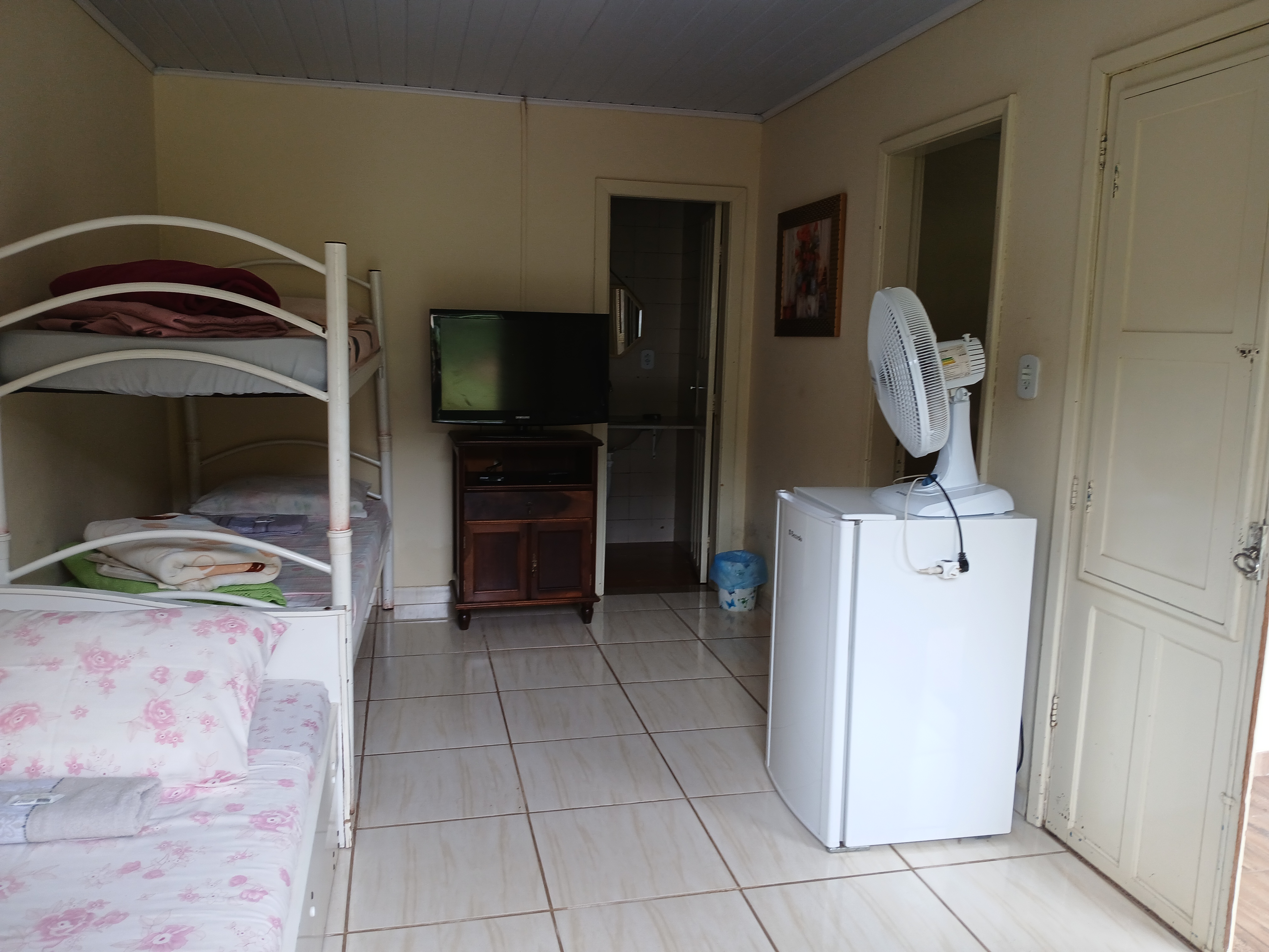 Quarto com uma cama de casal, 1 banheiro, um frigobar e uma TV LED.