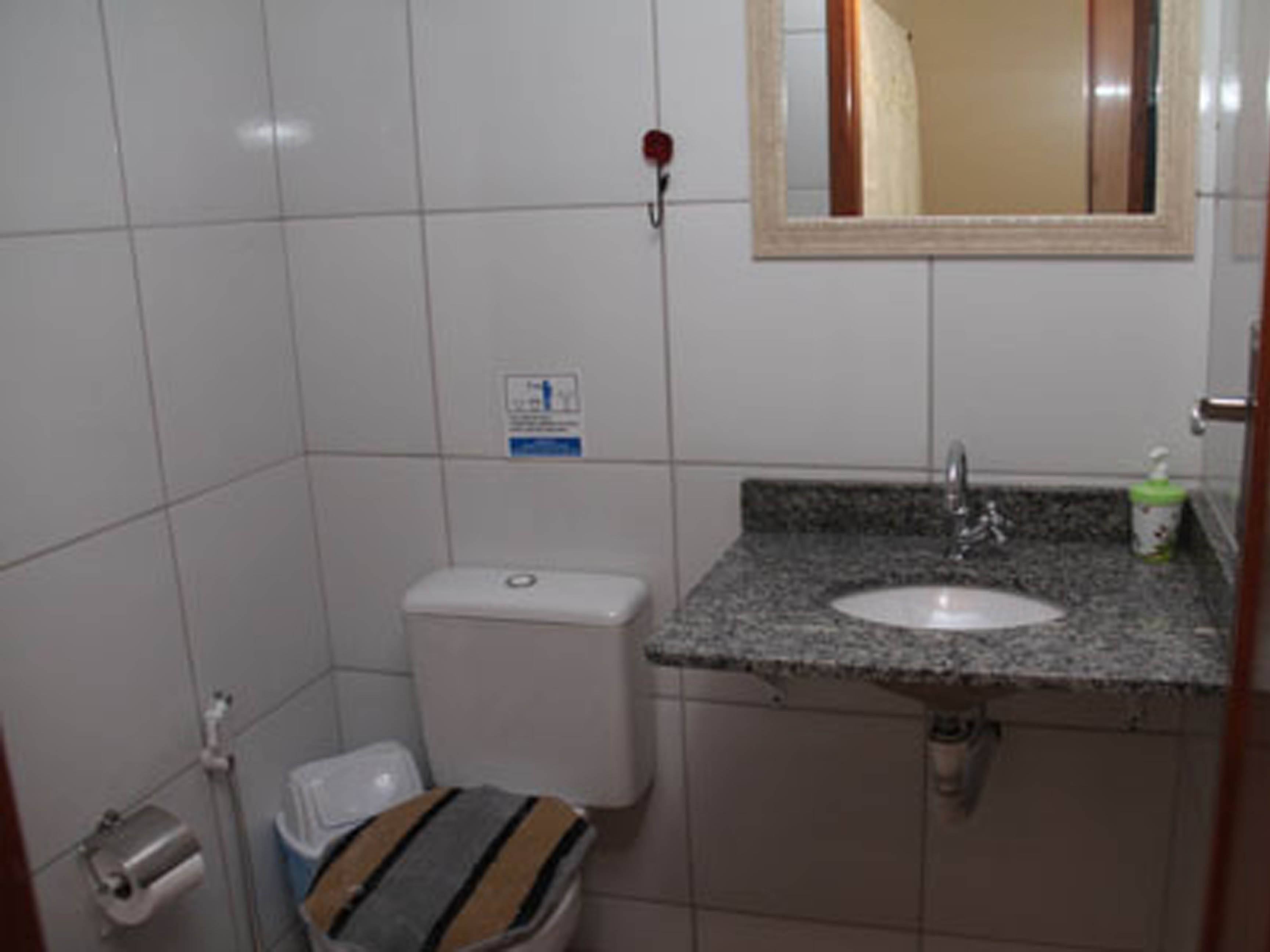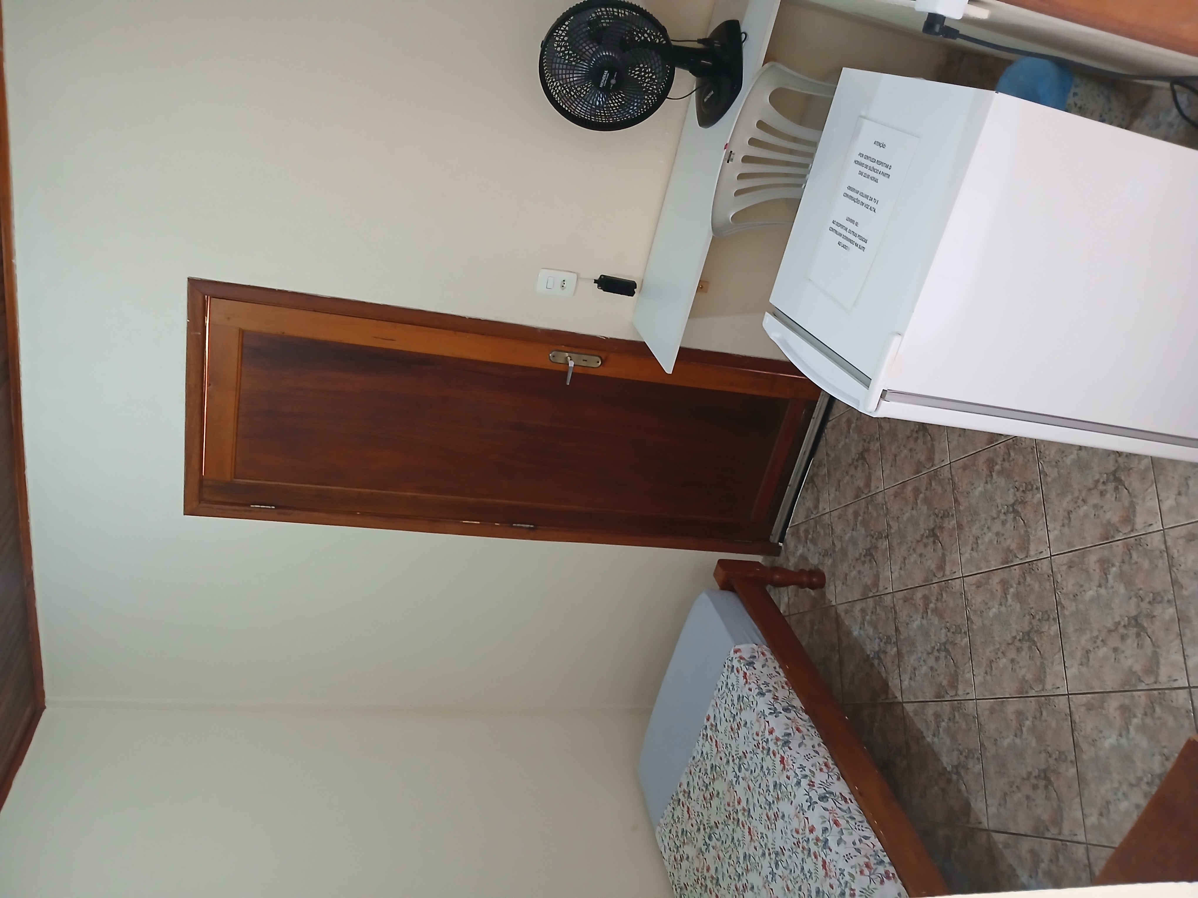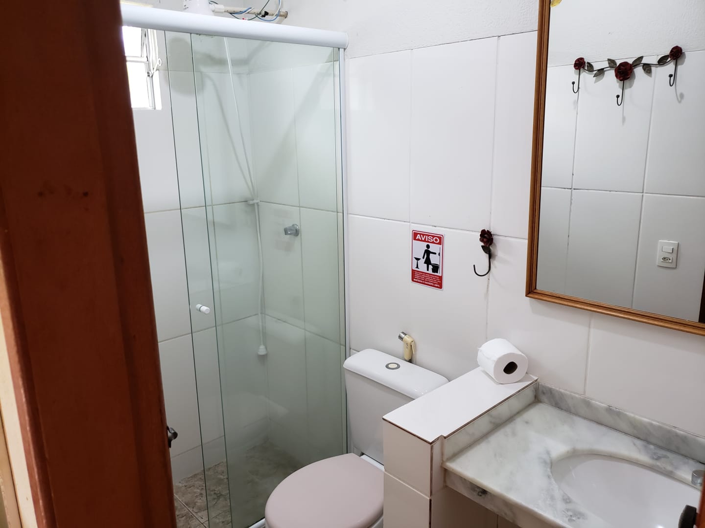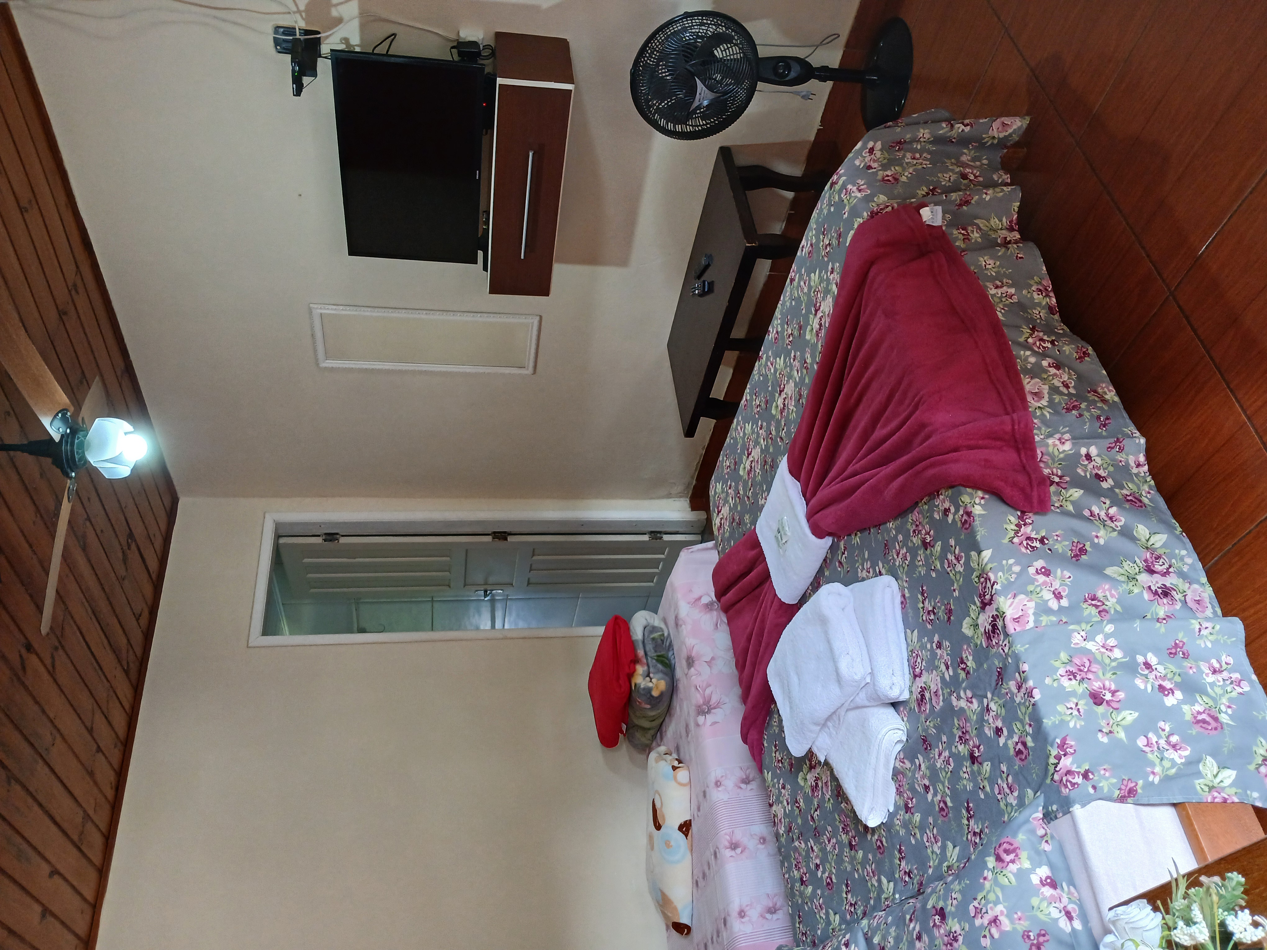 Quarto com uma cama de casal, 1 banheiro, um frigobar e uma TV LED.
