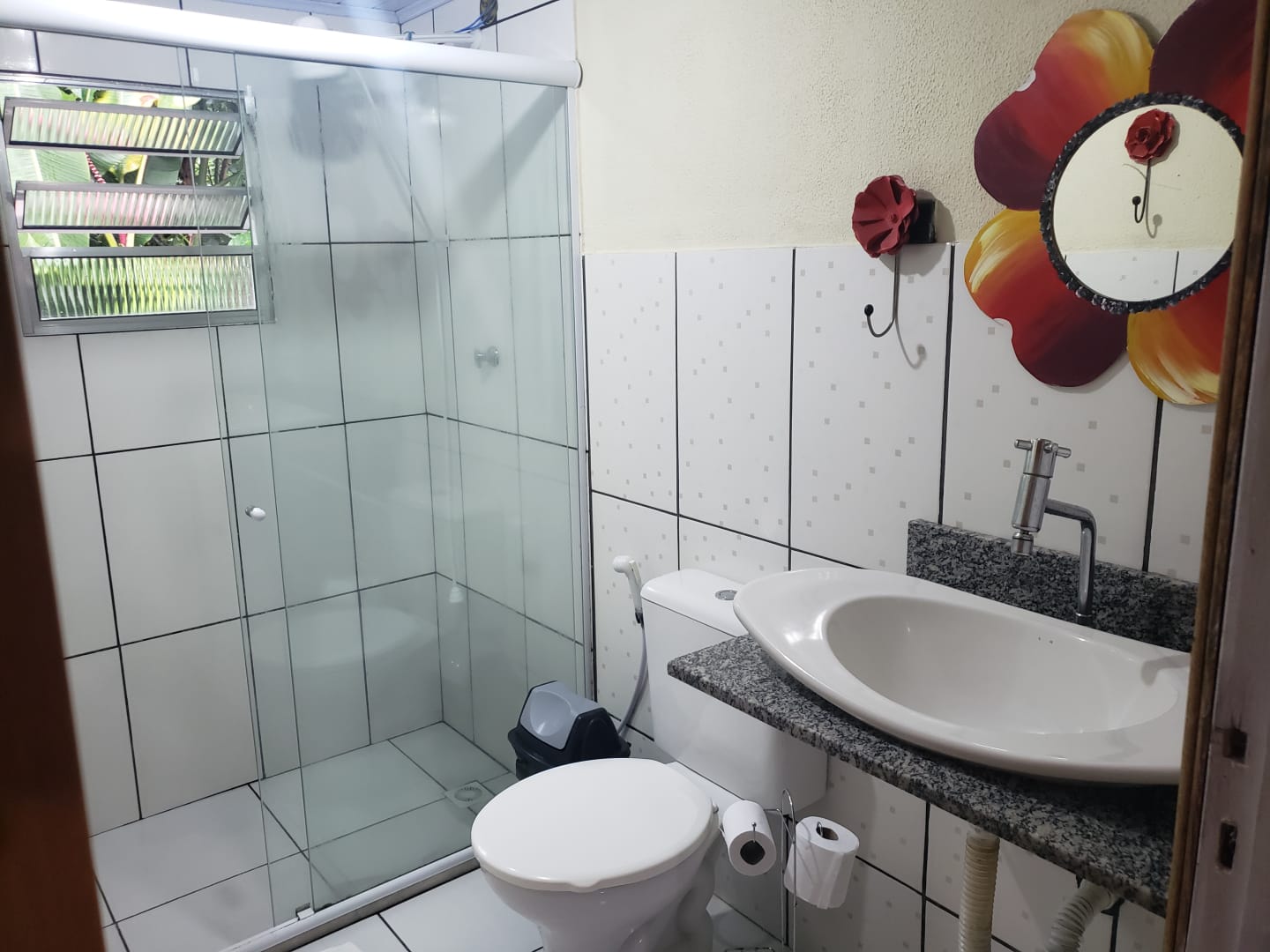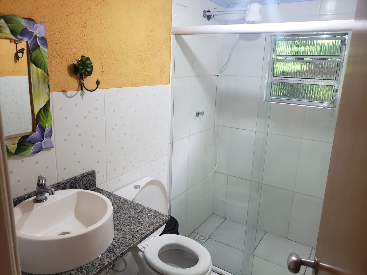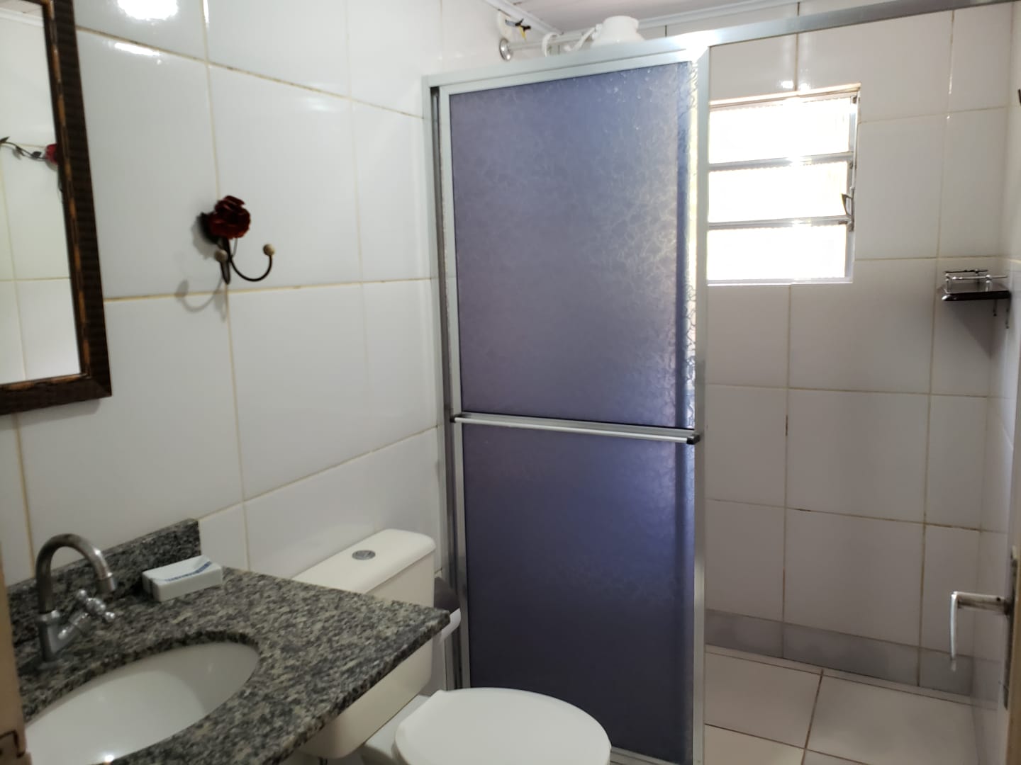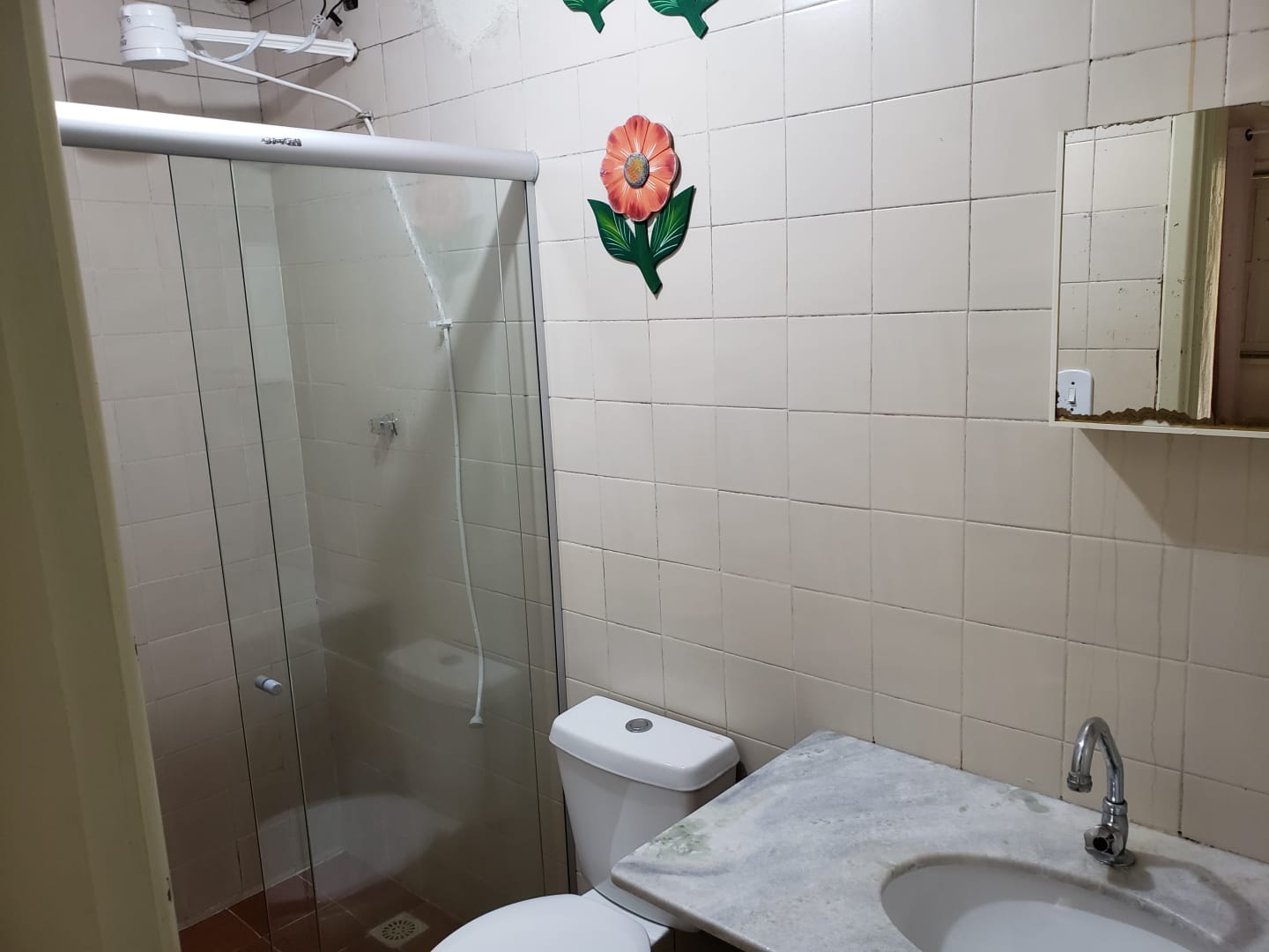 Quarto com uma cama de casal, 1 banheiro, um frigobar e uma TV LED.